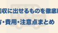 | 粗大ごみ・対象外品目 | 家具、大型家電、危険物を通常集積所へ | 粗大の予約や指定引取へ切り替え | 粗大受付・指定引取場所 |